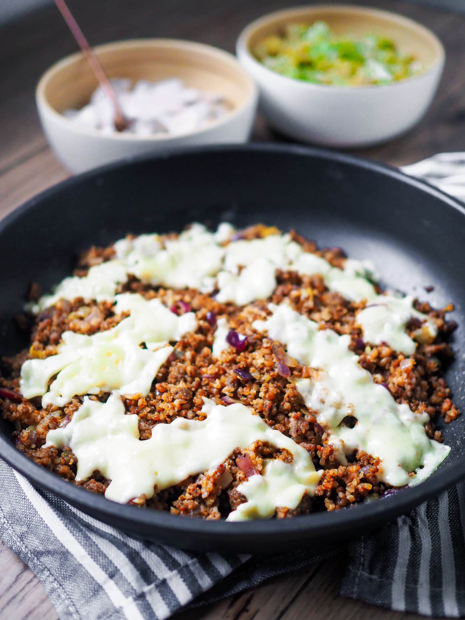 - Gib den gequollenen Bulgur in die Pfanne und rühre ihn unter Hitze kurz ein. Schmecke das Gericht ab und würze es nach Belieben. Verteile Mozzarellakugeln auf der Bulgur-Hack-Pfanne, decke sie mit einem Dunstdeckel ab und lass sie schmelzen. Schneide Gewürzgurken und Lauchzwiebeln und gib sie dazu.