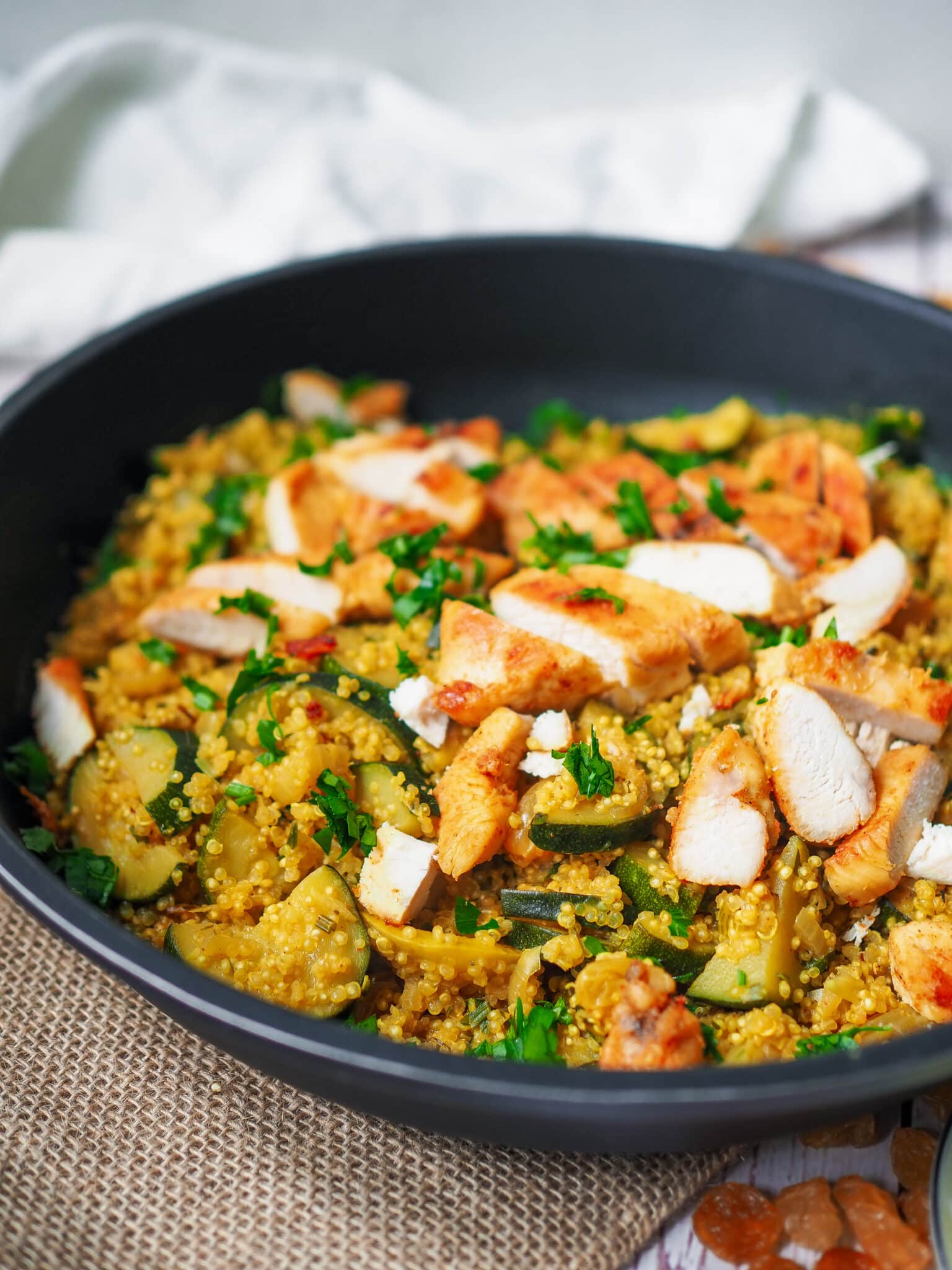 Couscous ist reich an komplexen Kohlenhydraten, die dir langanhaltende Energie liefern. Hähnchenbrust ist eine hervorragende Proteinquelle, die deinen Muskelaufbau unterstützt. Zucchini liefert wertvolle Vitamine und Mineralstoffe, während Zwiebeln und Knoblauch das Immunsystem stärken. Dank der Gewürze wie Kurkuma und Ingwer profitierst du zusätzlich von entzündungshemmenden Eigenschaften. Das Gericht ist kalorienarm und proteinreich, was es zu einer idealen Wahl für alle macht, die sich gesund ernähren möchten.