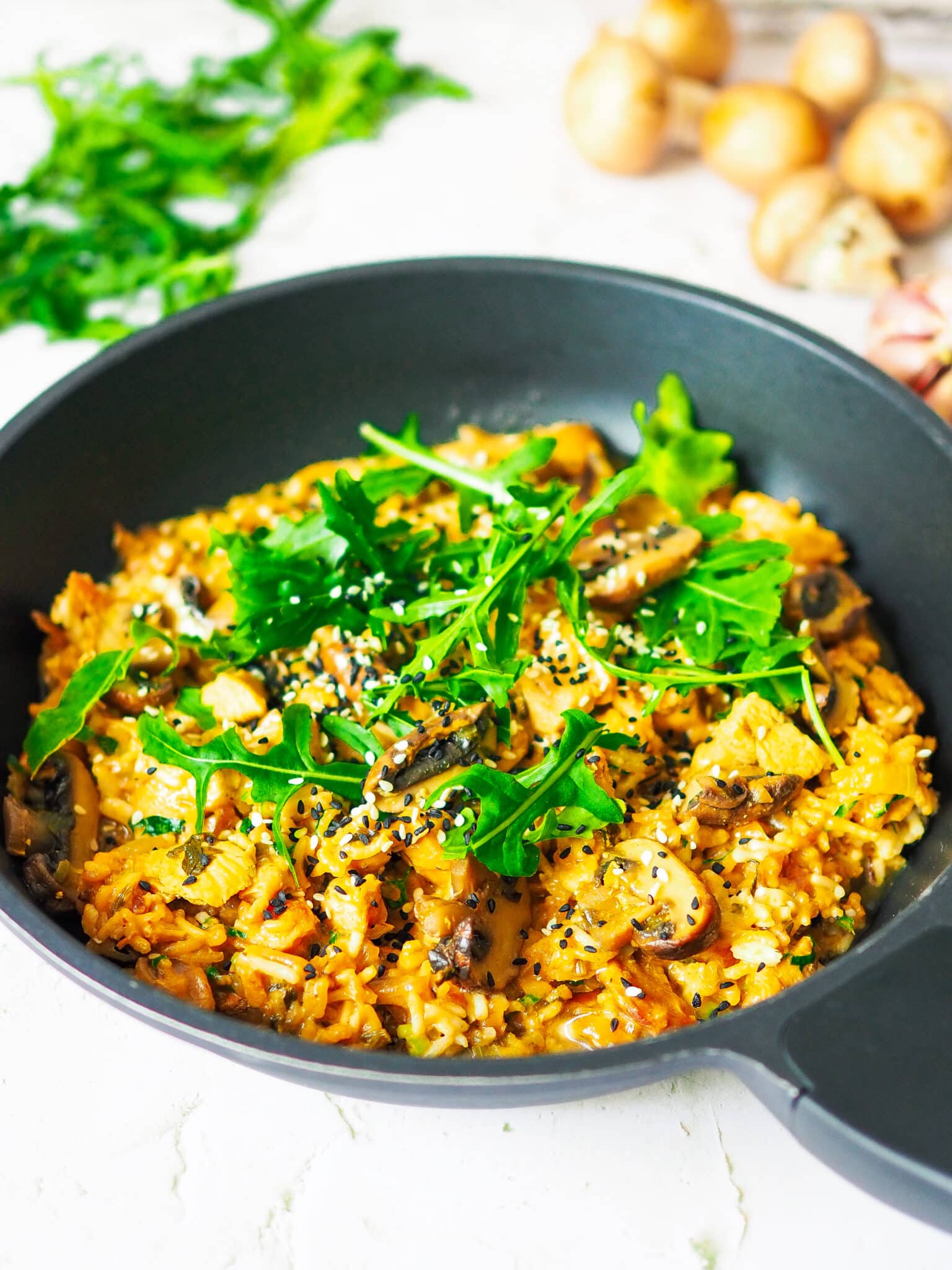 Dieses einfache Risotto Rezept mit Pilzen und Hähnchen vereint zartes Hähnchen, herzhafte Champignons und würzigen Reis zu einem köstlichen Gericht voller Geschmack und ist in nur 30 Minuten zubereitet.