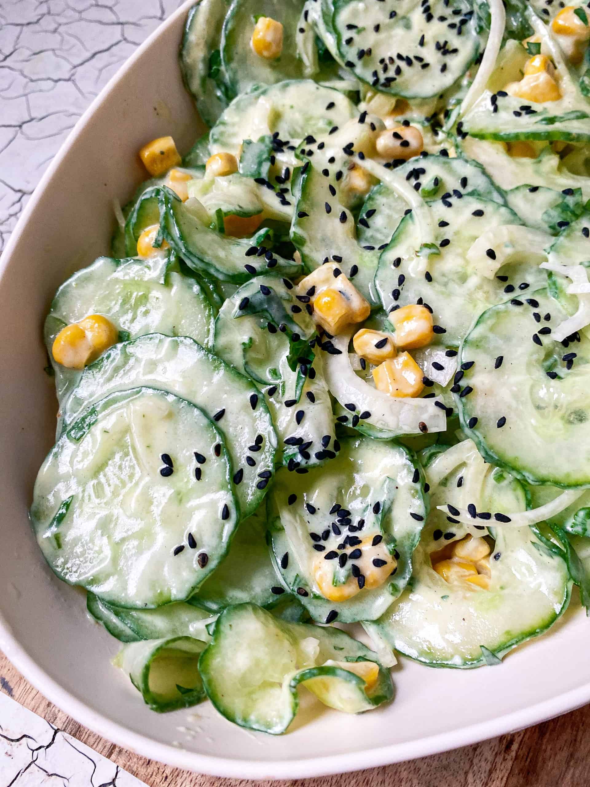 Der schnelle Gurkensalat mit Joghurt ist nicht nur lecker, sondern auch gesund! Gurken enthalten viele wichtige Vitamine und Mineralstoffe wie Vitamin K, C und Kalium. Der Mais liefert wertvolle Ballaststoffe und Antioxidantien. Durch den Naturjoghurt und das Olivenöl wird der Salat kalorienarm und proteinreich, während der Honig und Senf ihm eine besondere Geschmacksnote verleihen. Der Salat ist low-carb und glutenfrei, was ihn zu einer idealen Beilage für viele Ernährungsweisen macht.