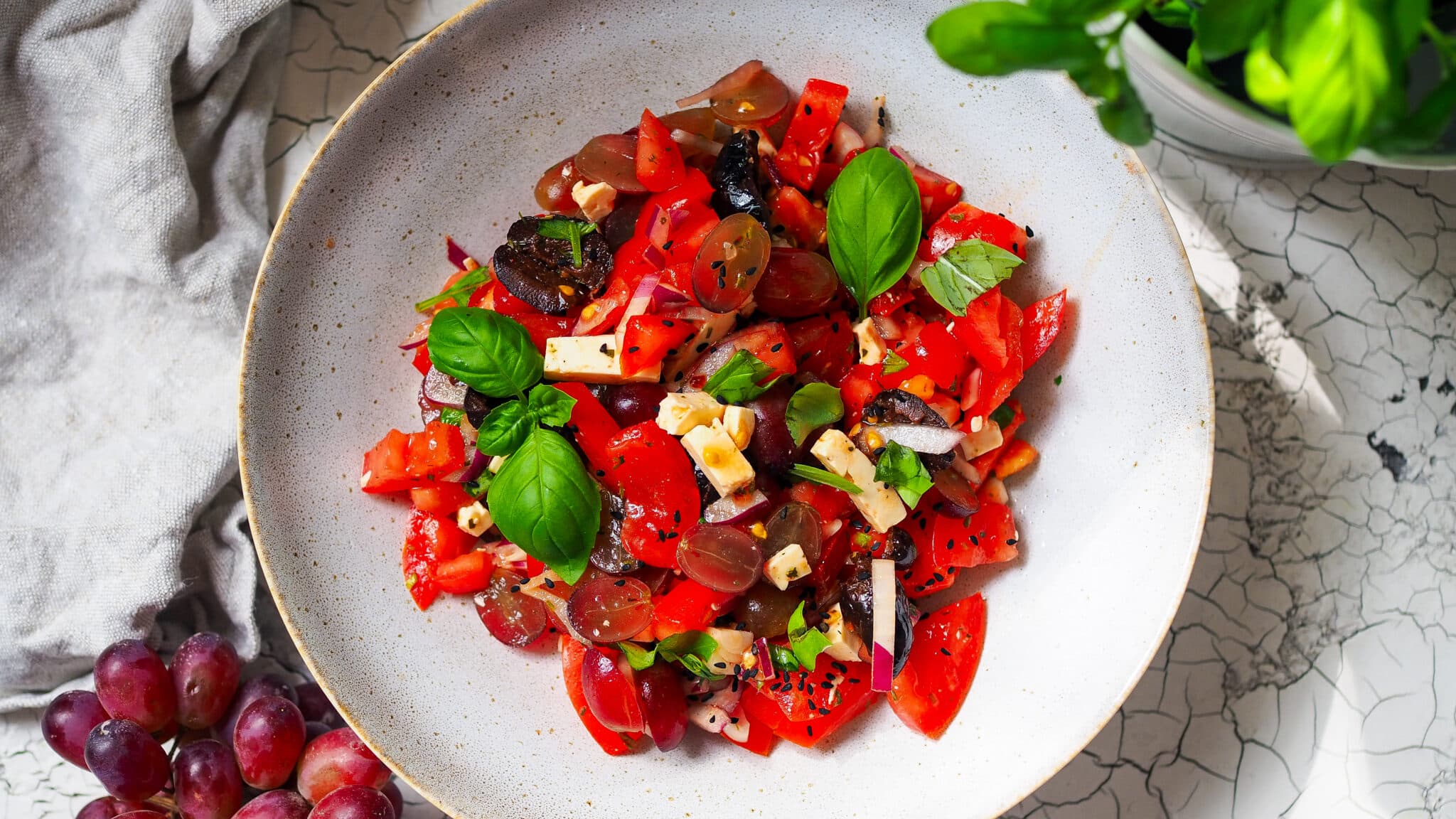 Mediterraner Tomatensalat mit Zwiebeln, Weintrauben und Schafskäse: